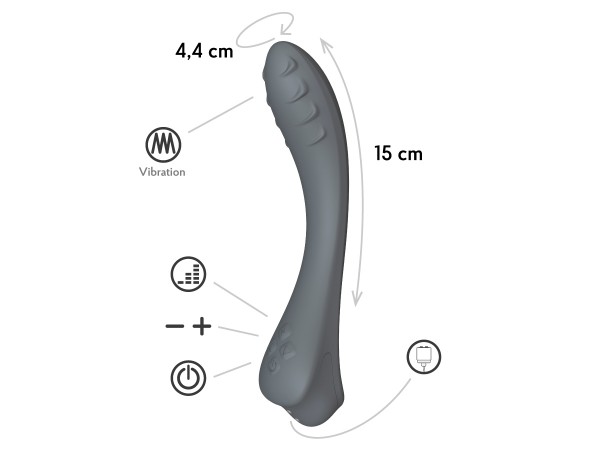 Выполнен вибратор из медицинского силикона в графитовом цвете. Абсолютно гипоаллергенный. Не имеет швов, стыков, посторонних запахов. По тактильным ощущениям бархатистый, в меру упругий